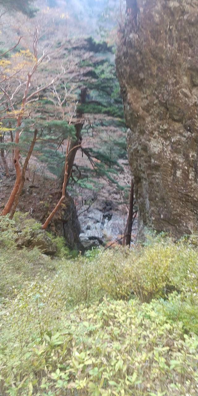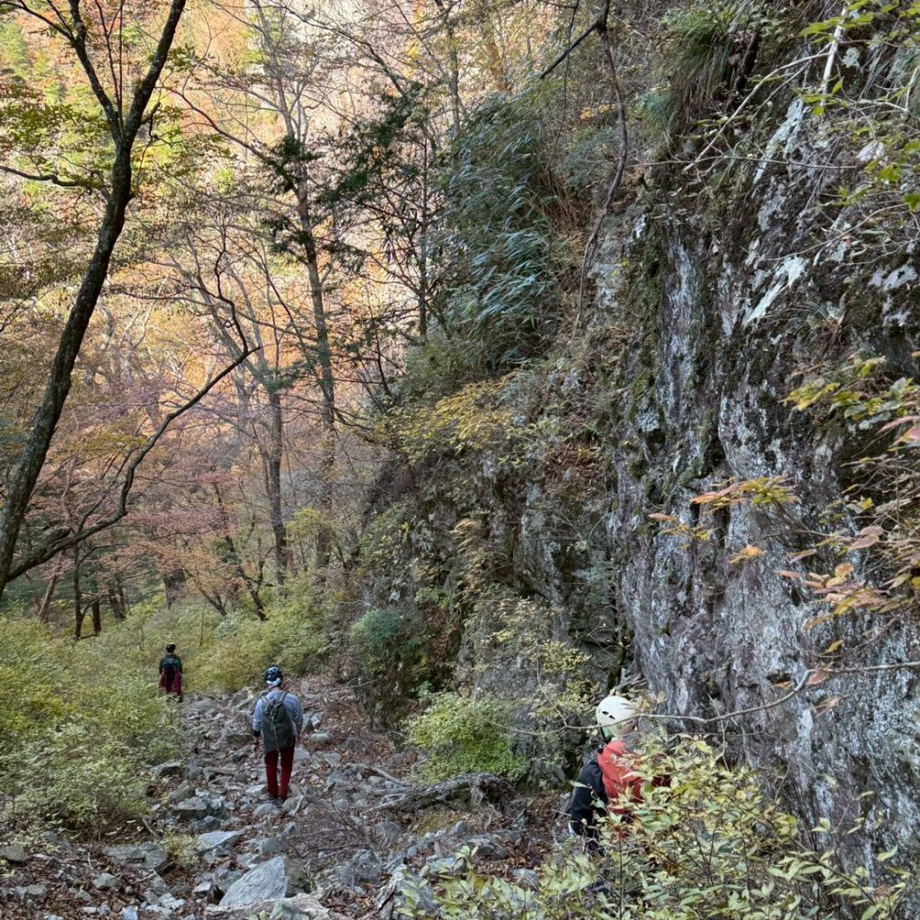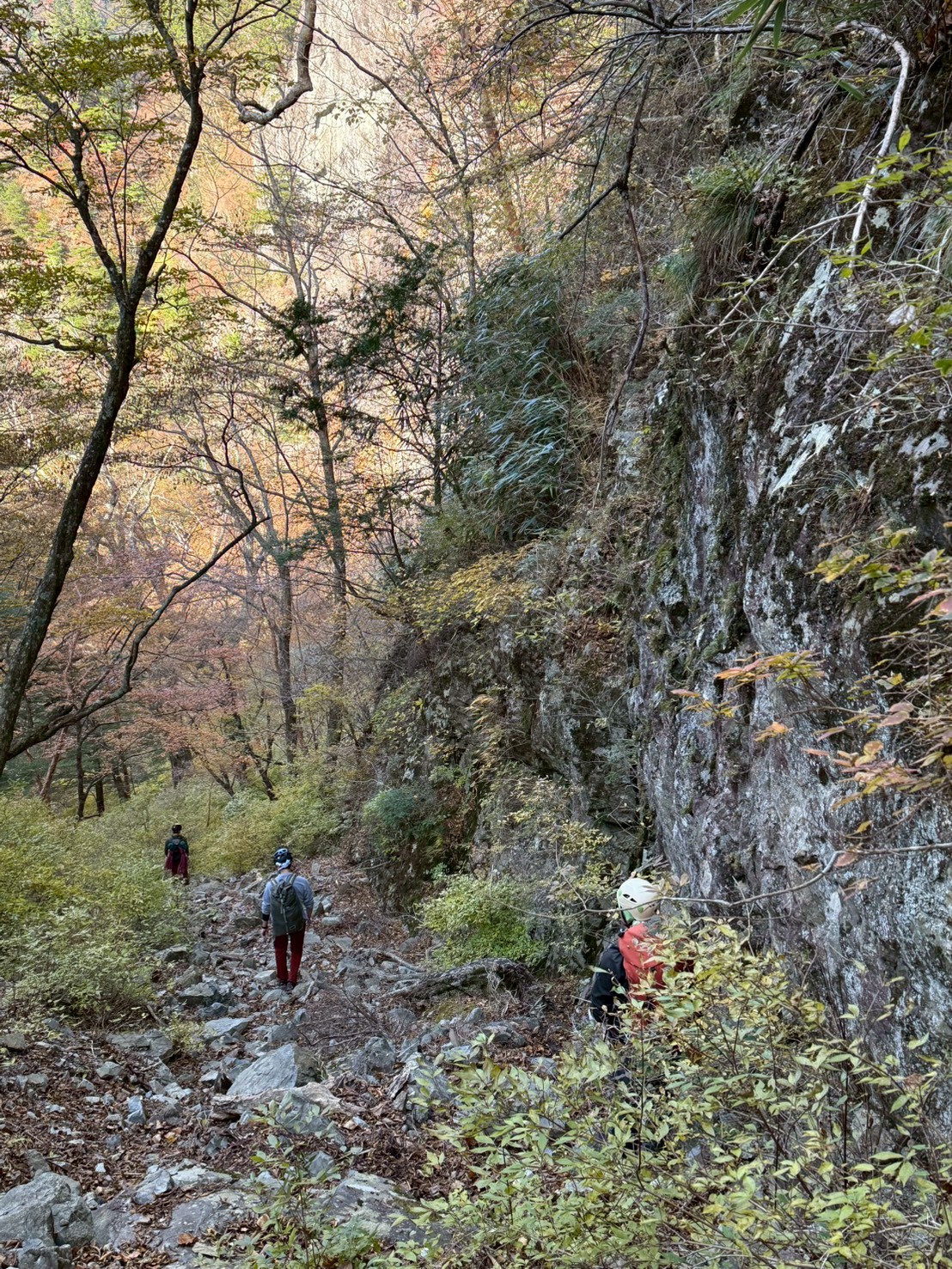 テープに従って沢地形から次に「谷底に向かって右側の岩壁」伝いに進む。10月の敗退時は取り付き点まで下見しているのでアプローチはばっちり👌