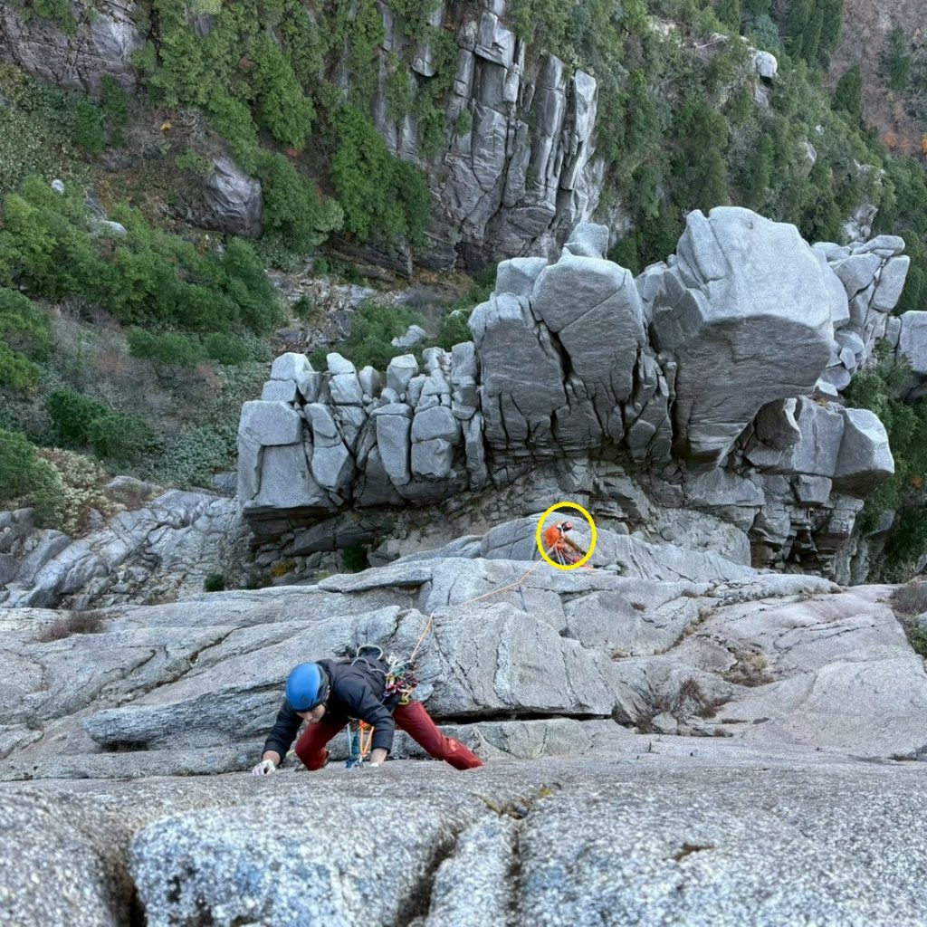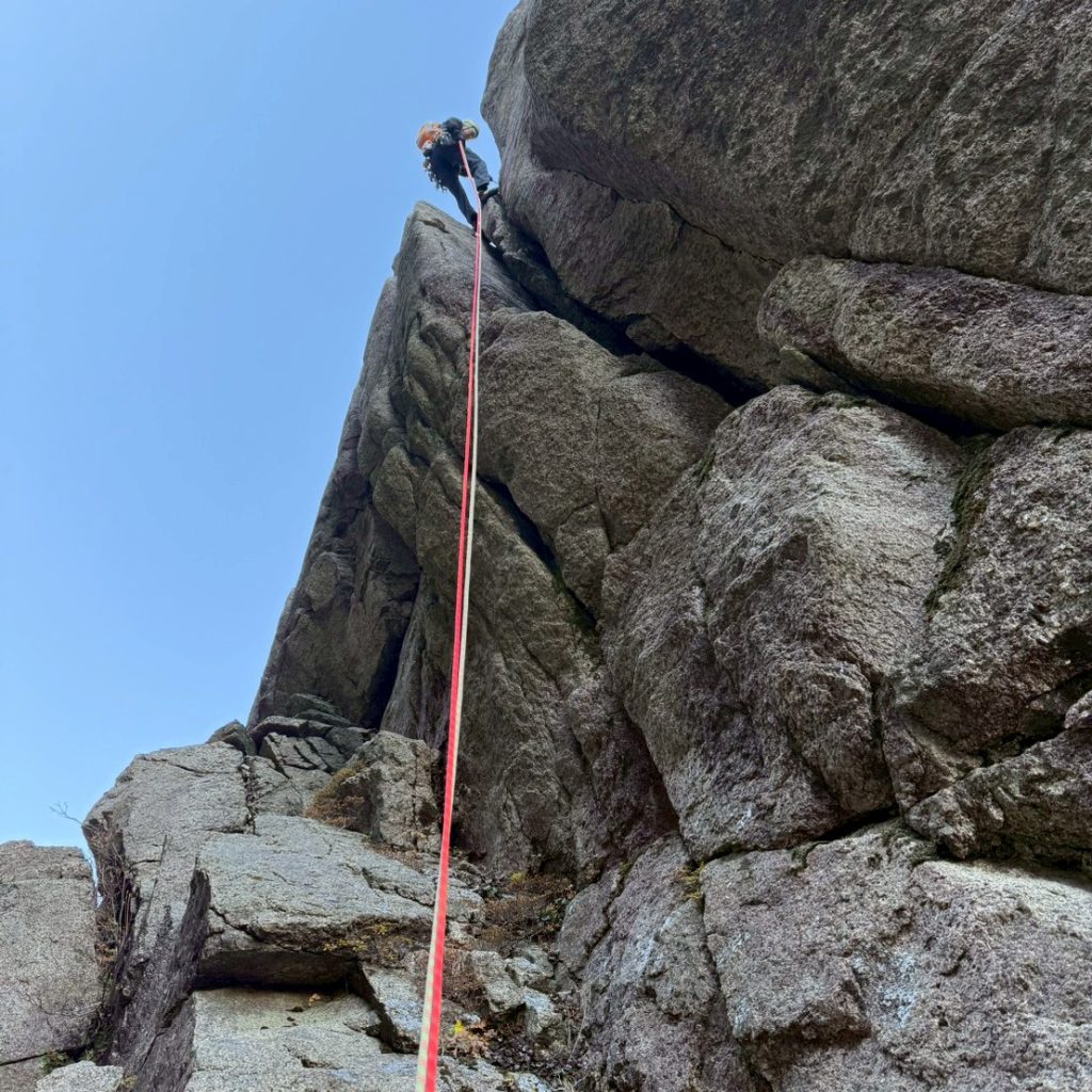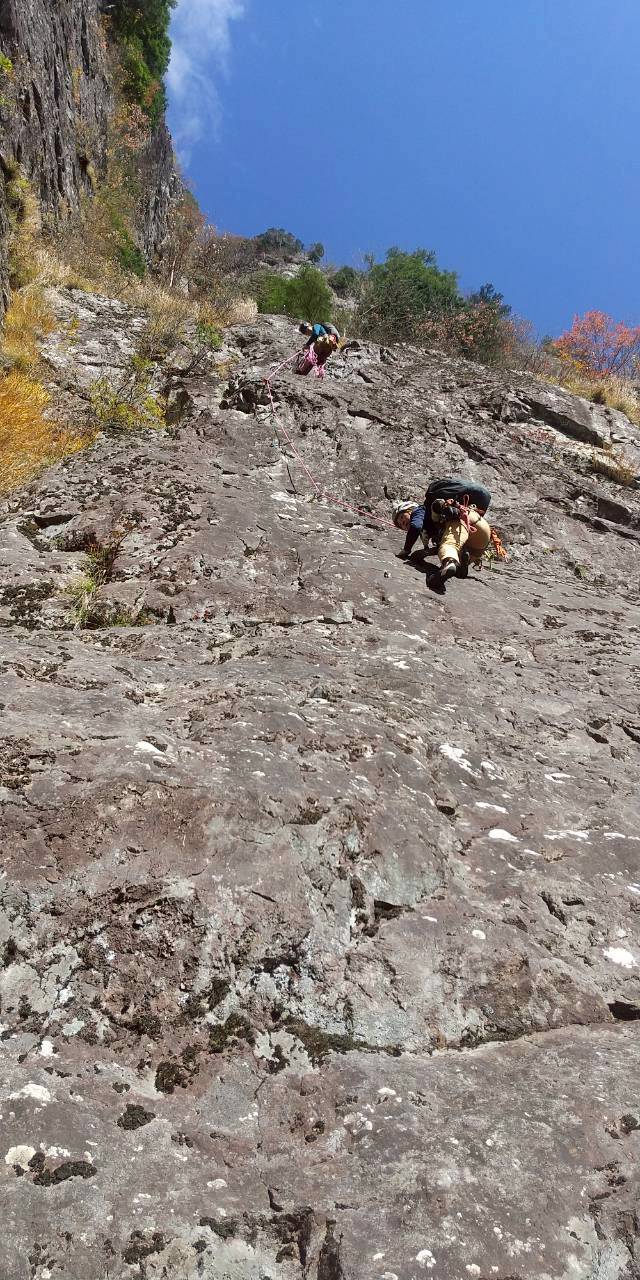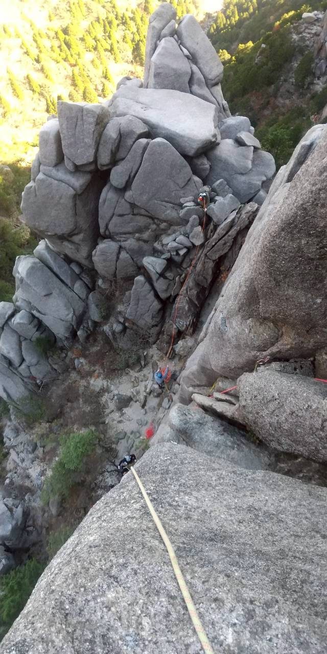 下の写真はP3の脇を通って、P4のピーク付近のところ。下の人がいるところに下がって懸垂下降をした方が良いが、そこまでクライムダウンするのは危険なので、5mくらいのこの高さも一応懸垂した。