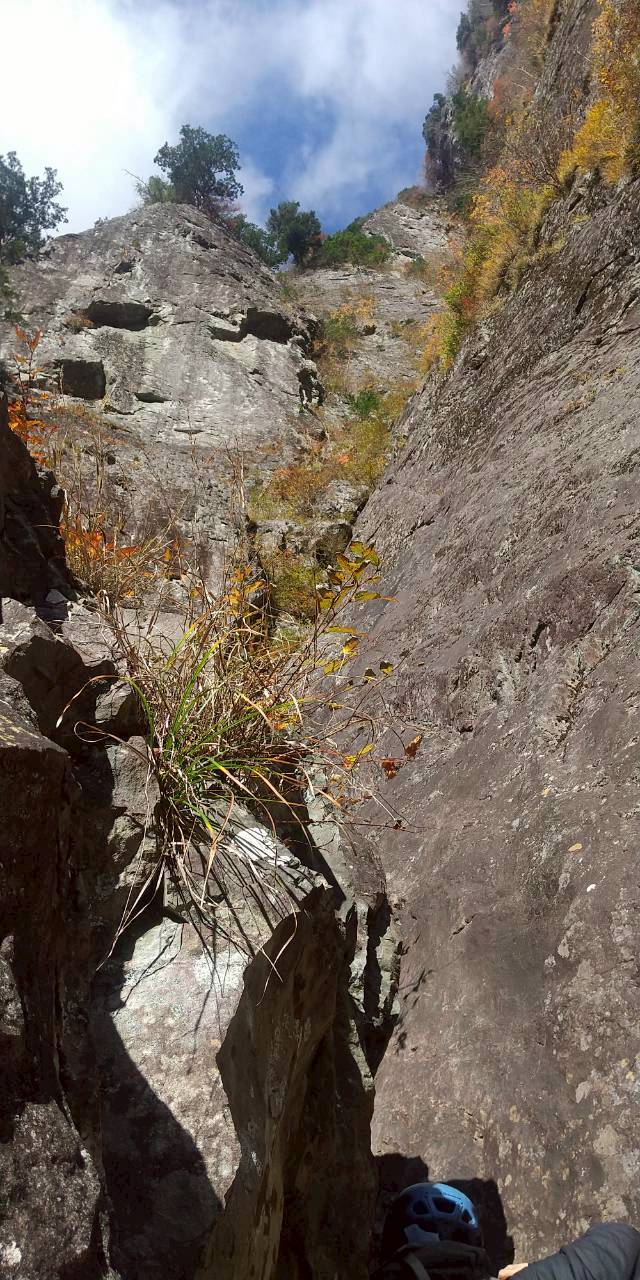 中尾根P3 3ピッチ目、ワイドクラック登りでクラック内に入るとちと難しい。クラックに入らずフェイスでホールドを拾っていくとそうでもないらしい。