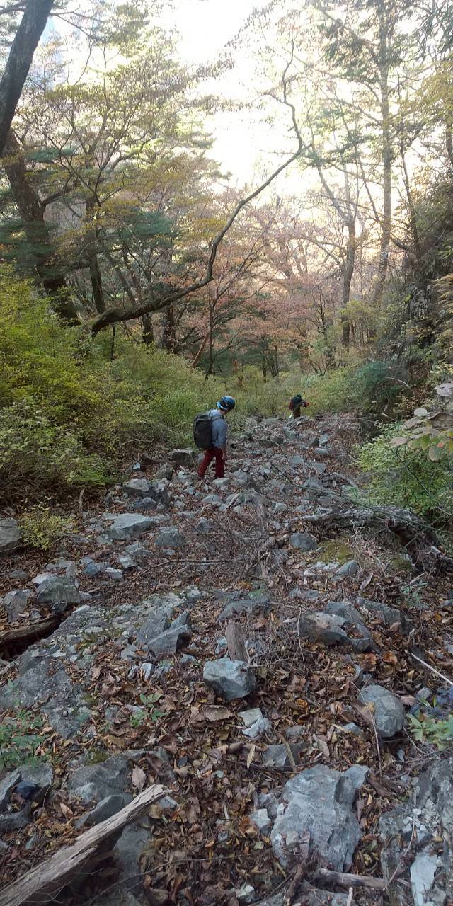 尾根状のところを一つ越えたらシオカラ谷に向かう沢地形になるので、そこを下っていく。下の写真はその沢地形を下って半分くらい行ったところ。ガラガラで結構悪い。落石注意。