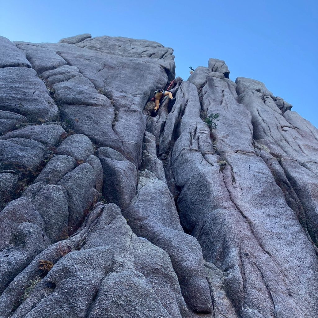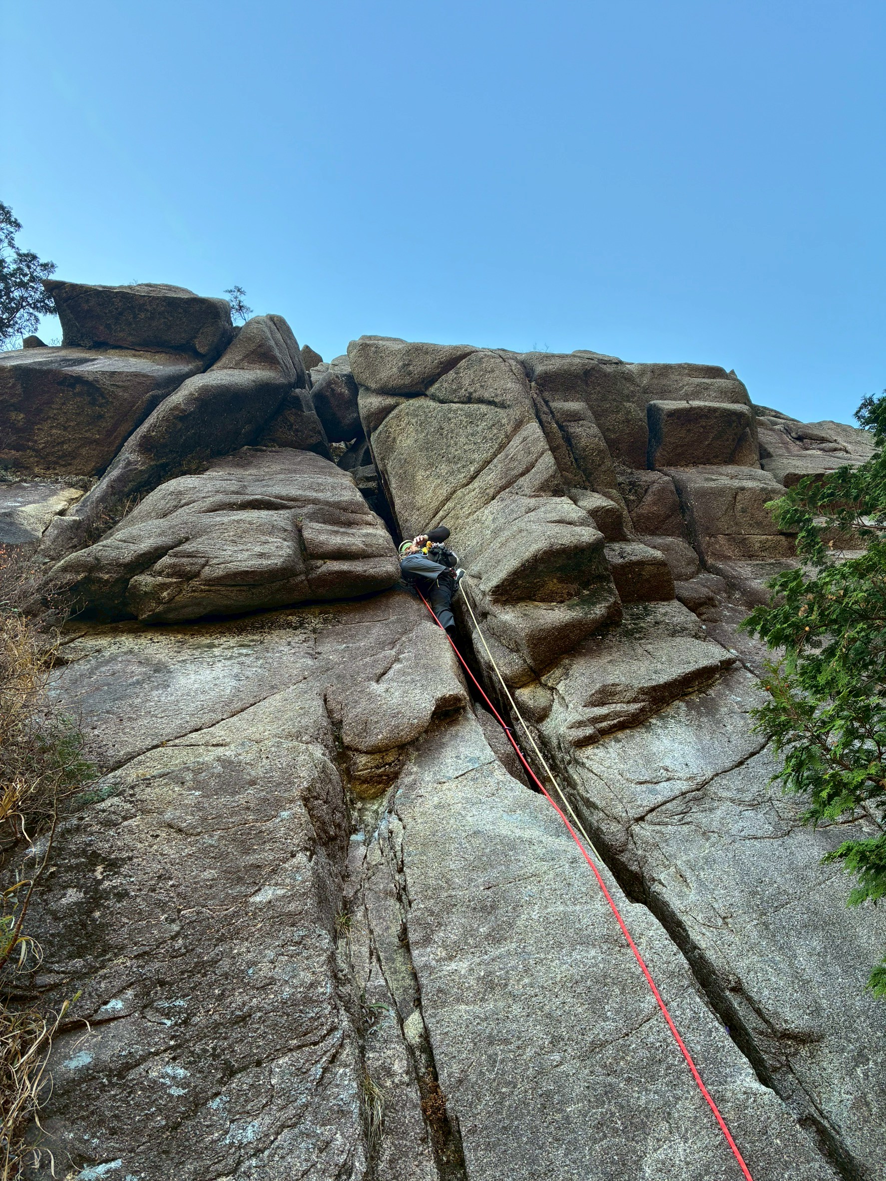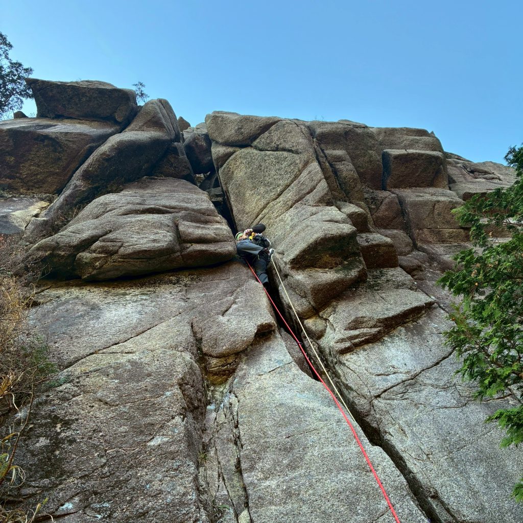 右壁のサンダーボルトのある岩場を見ながら、壁伝いを引き続きトラバースしていき、少し尾根状のところを乗り越すと、サマーコレクションの取り付きに到着!順調にいってビジターセンターから1時間くらい。1ピッチ目はロープ不要とのことだが、そんなにやさしくないので慎重に。出すならロープ出した方が良いかもだがノープロテクション。カムは使えそうだが、2ピッチ目以降はカムは不要。全体のグレードを通して、辛めなので、油断しない方が良いかと。