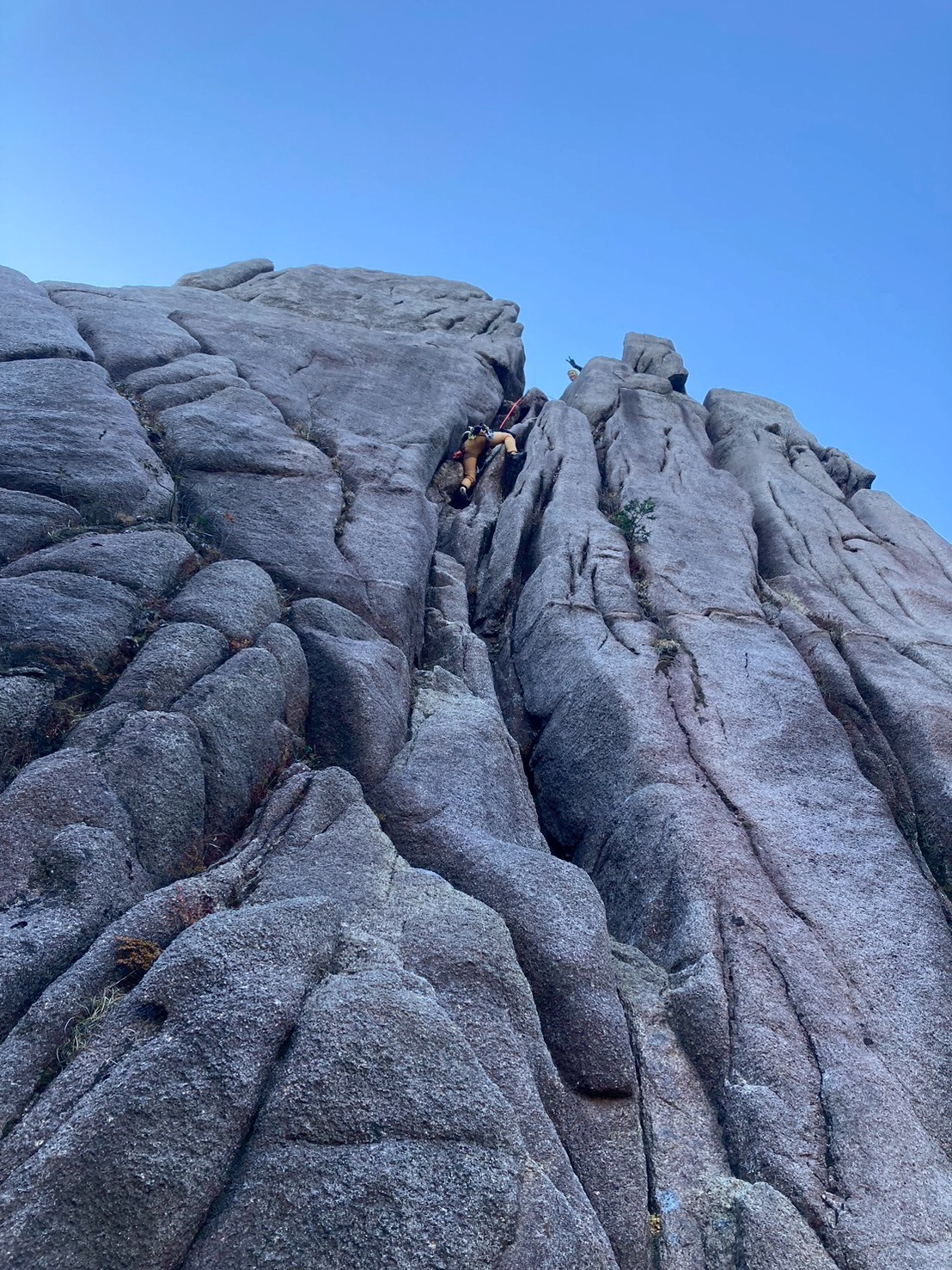 やっとこさの9ピッチ目終了点!最後の最後でちょっとしたハング越えが出てくる。