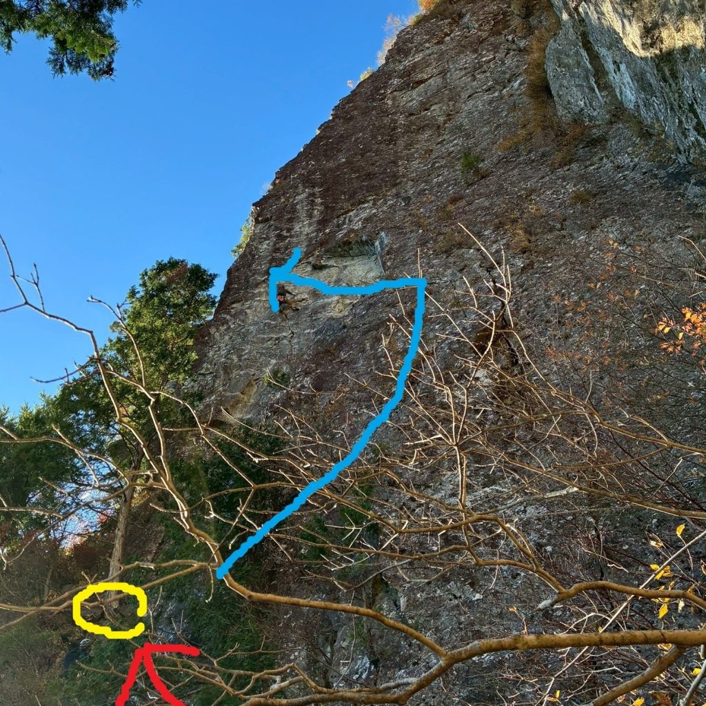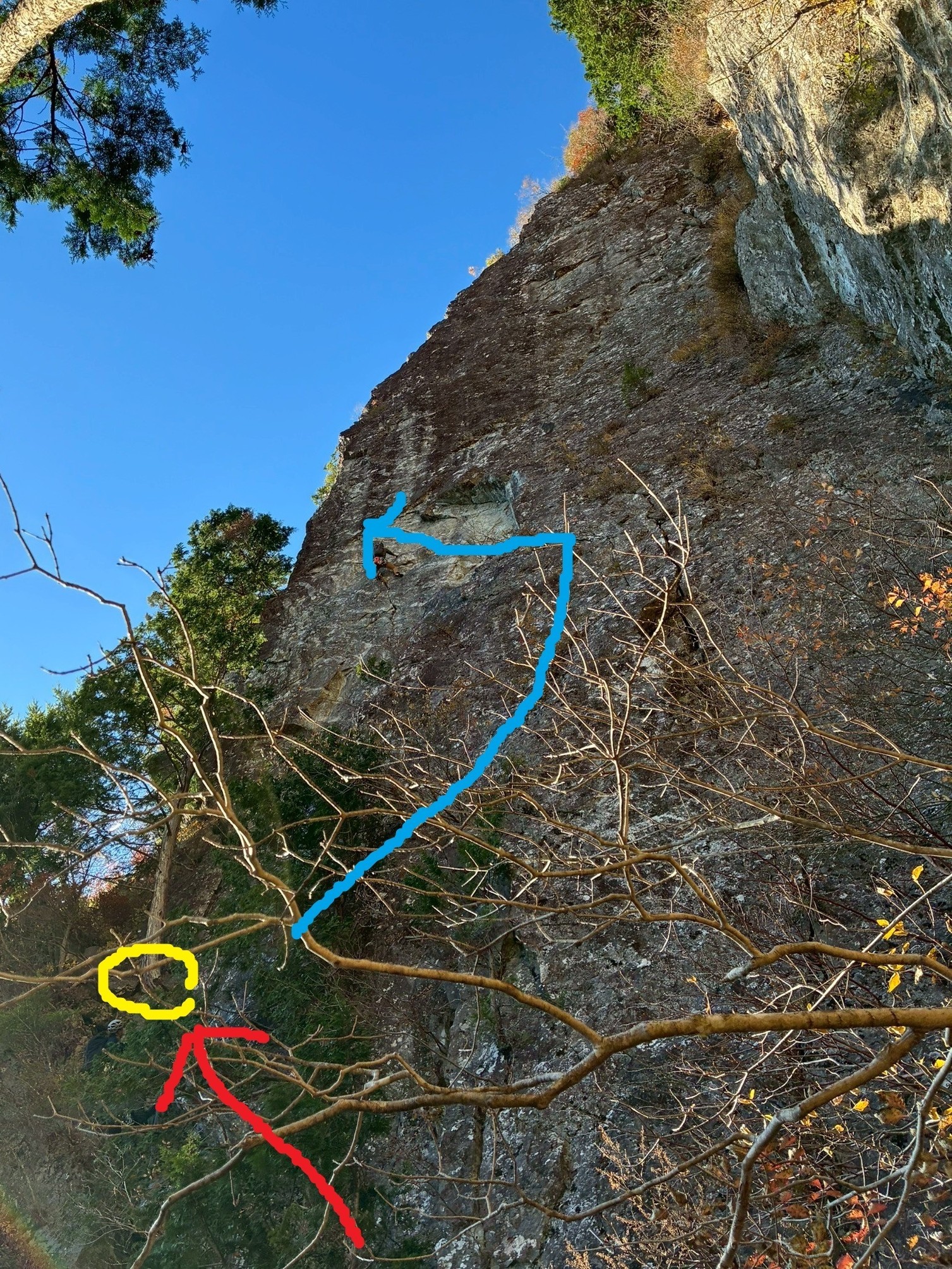 他の山行記録にある通り、少しわかりづらい。岩の上方を見て左にトラバースするもの。バンドが凹を経て左面の壁に向かい、左上に伸びるバンドを登っていくもの。支点のボルトを追っていけばよいのだが、パッと見で左の壁が「こんなところ登るの?」という感じ。でもいざそのバンドに入るとそれほど困難ではない。下図の写真は6ピッチ目スタート地点(=5ピッチ目終了点)から上に向かって撮影したもの。赤矢印は「トラバースで凹角を経た後の左上するバンド」。黄色丸の木でピッチを切る。7ピッチ目が青矢印。