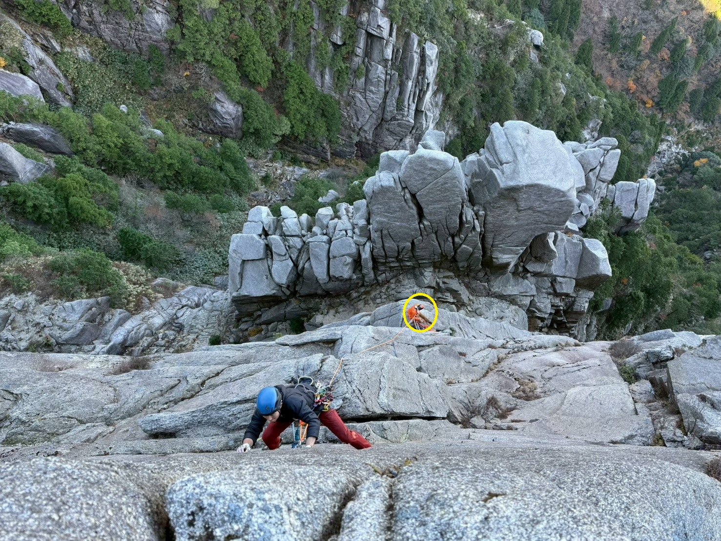 黄色丸がP2の下部ピッチの終了点。登っているのがP2上部。