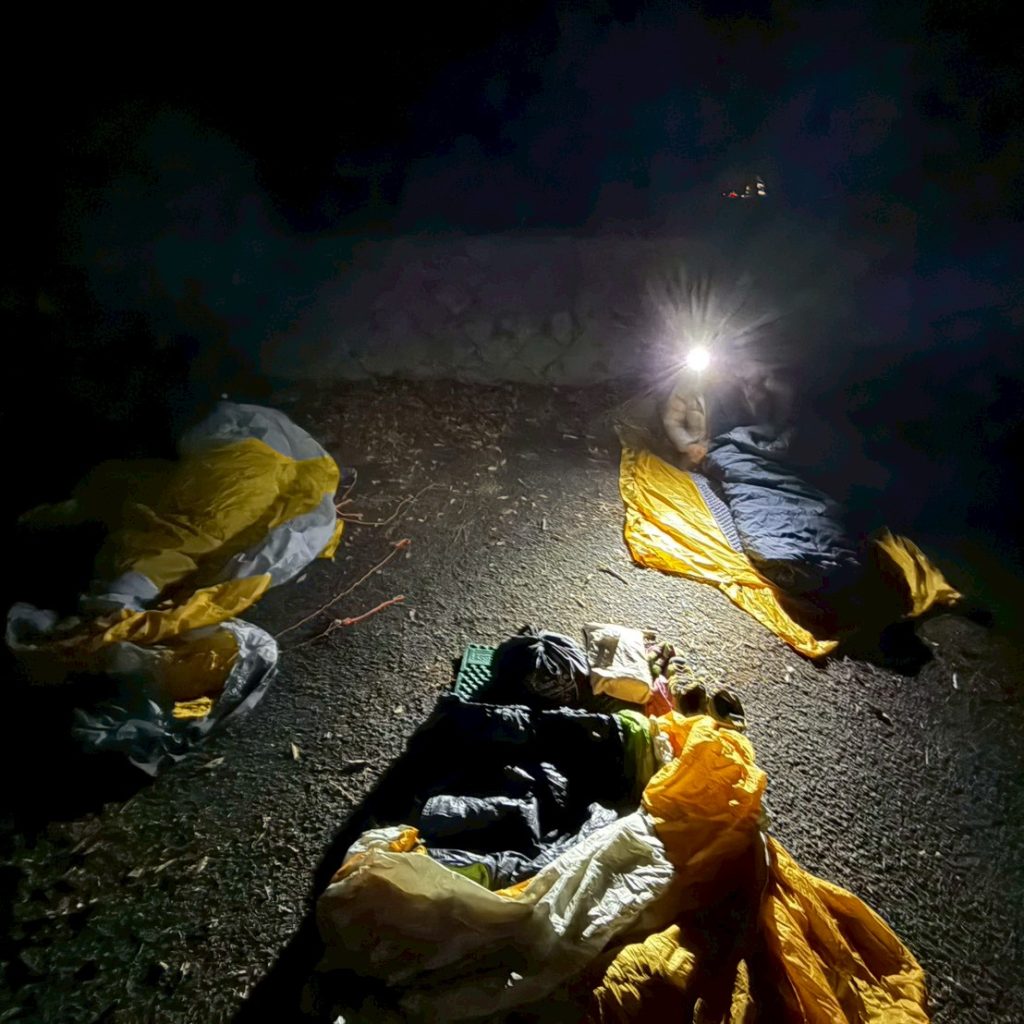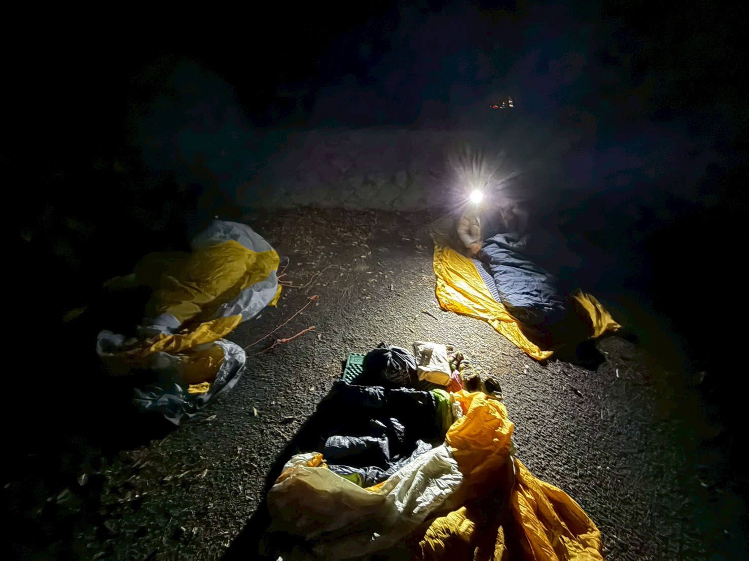 ということで、アスファルト上、露天にて就寝と相成りました。合掌。