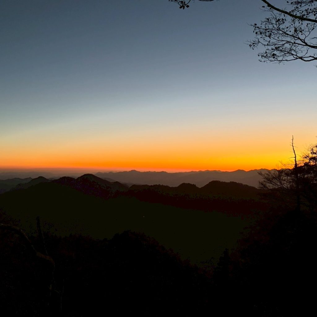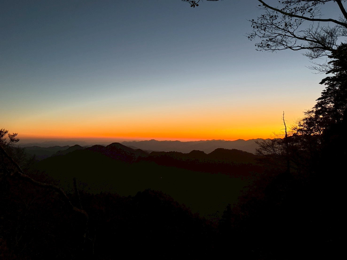 尾根道を伝って戻る間に空はすっかり「片割れ時」。幻想的な景色が視界いっぱいに広がる。いい日旅立ち