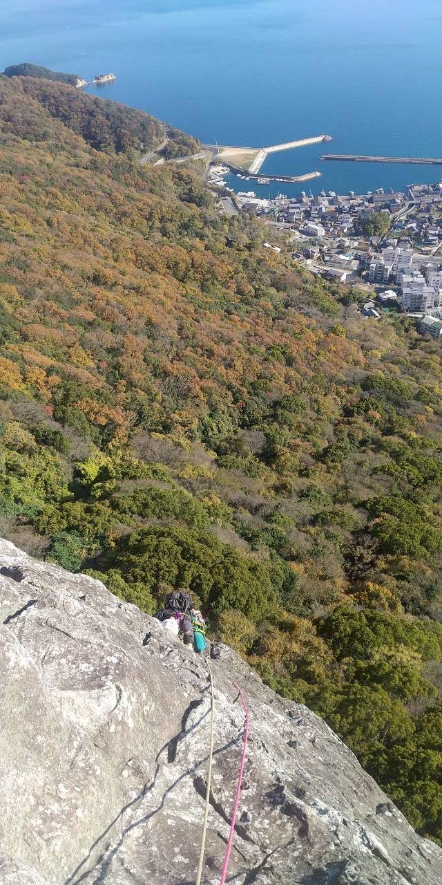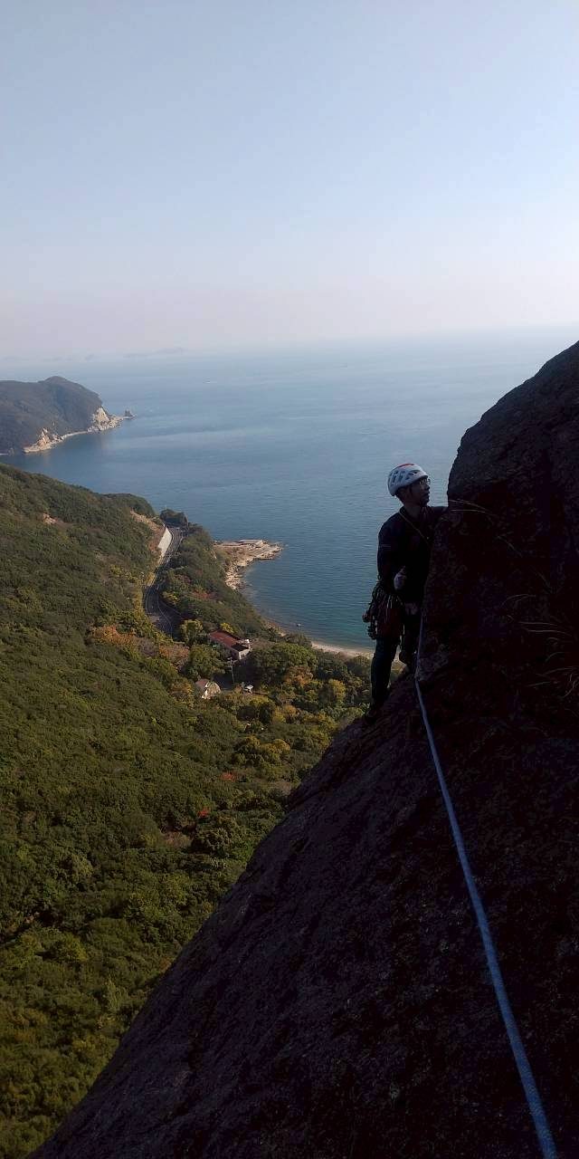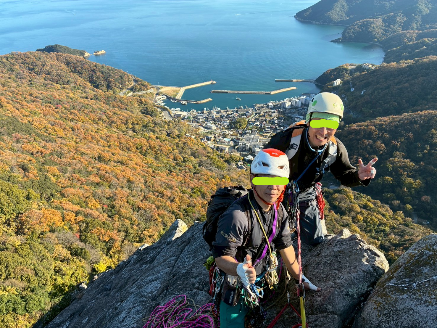 7ピッチ目を終えて終了点!奥に見えるのは「坂手港」かな。写真を撮ってくれた人は歩きでここまで登ってきた人。登攀ルートの反対側には登山道がある。
