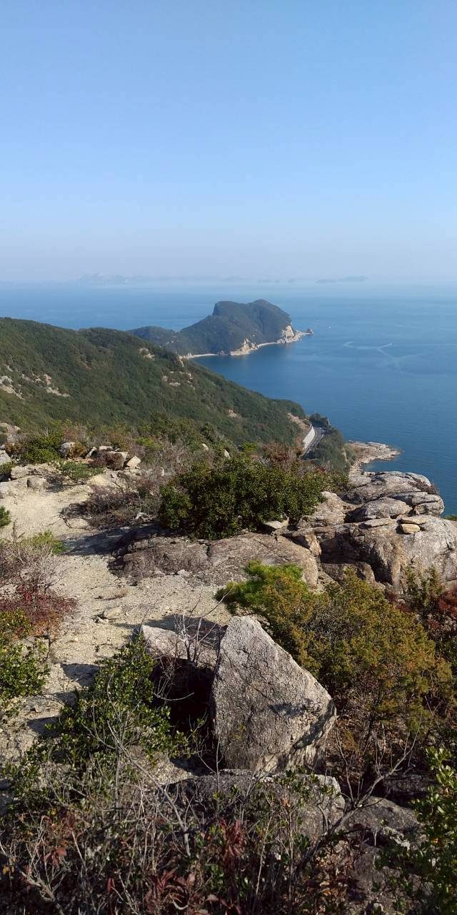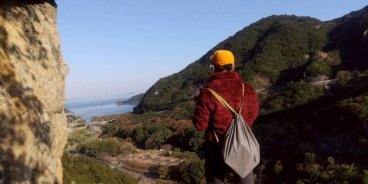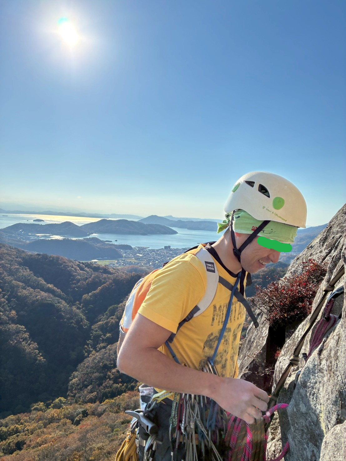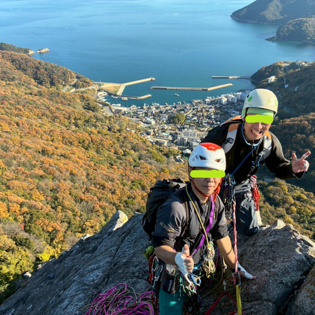 7ピッチ目を終えて終了点!奥に見えるのは「坂手港」かな。写真を撮ってくれた人は歩きでここまで登ってきた人。登攀ルートの反対側には登山道がある。