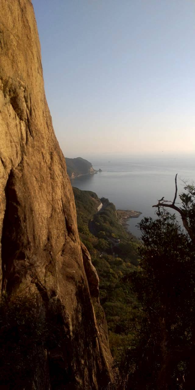 次はその確保支点のリングボルトから海側に向かって広がる傾斜の緩いスラブを歩いていく。支点が無くて最初は怖いがスラブのさらに上の祝い手が届くところになるとガバホールドだらけになり、カムも設置することができる。そこを巻いて安定した頂上となる。下の写真はインスボン上の安定した台地。景色、プライスレス💴