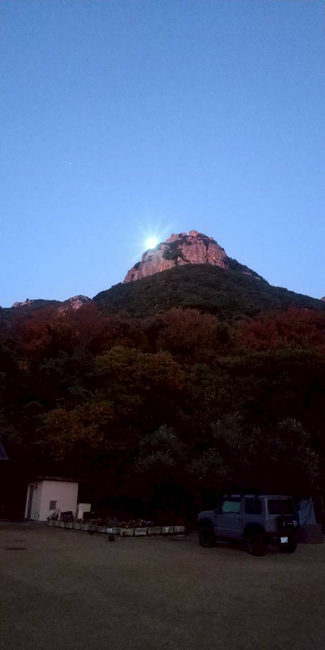 翌朝のオートビレッジ吉田。後ろの岩に月がかかる。朝晩はしっかり寒いので、シュラフは暖か目のがおすすめ。ぐっすり寝られた。