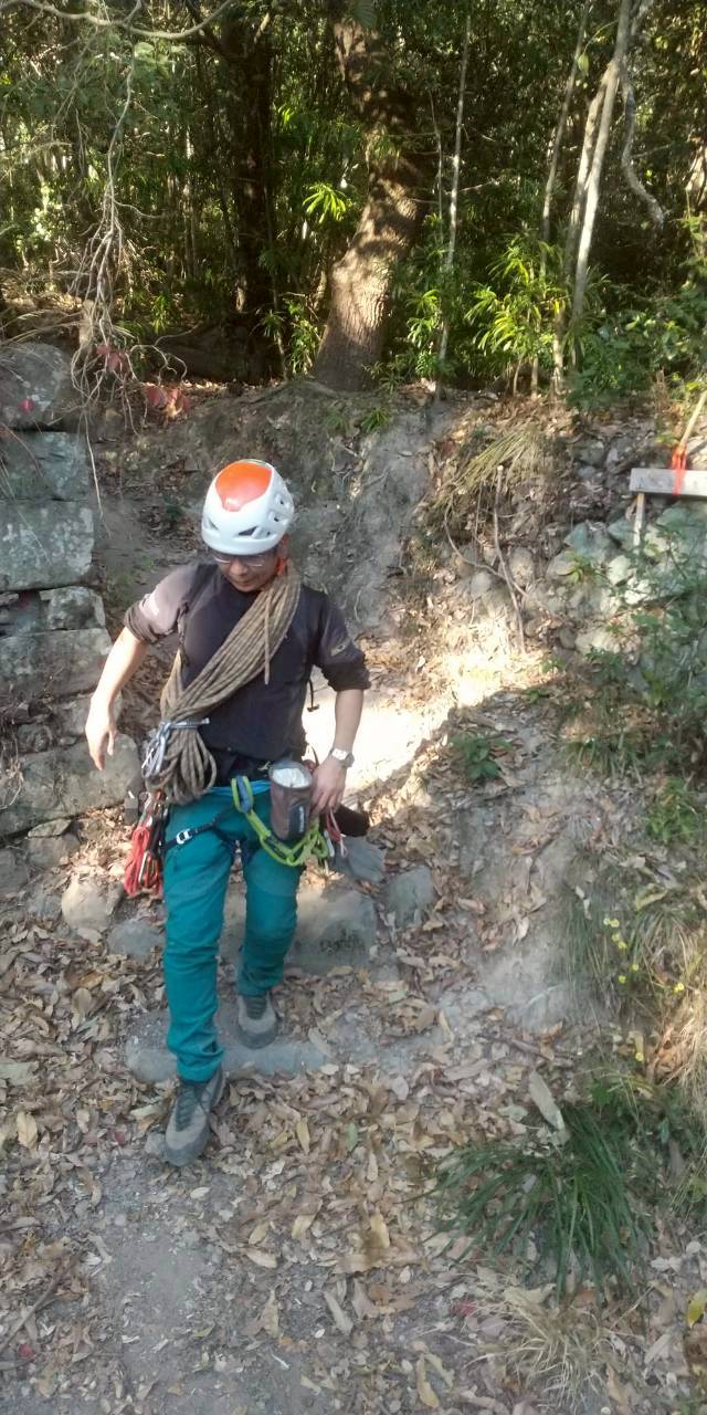 登山道にはフィックスロープがちゃんと張ってある。それを伝って下ると往路の拇指岩基部に至る。