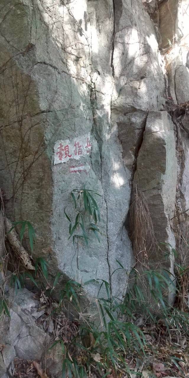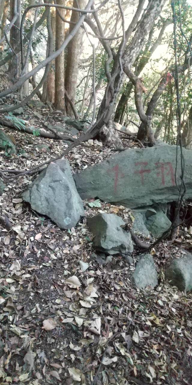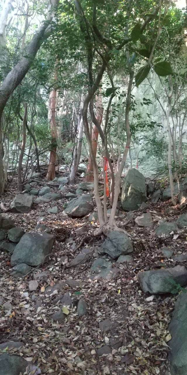 下の写真は下山の時の写真なのでこちらに向かって歩いているが、上の写真の矢印に従って左に石垣のある林道を歩いていくと下の写真のような木の案内板が左に見える。ここを入って赤テープなどを追って拇指岩に向かって歩いていく。途中で赤テープが途切れる場所があるが踏み跡などをよく見て進んでいく。