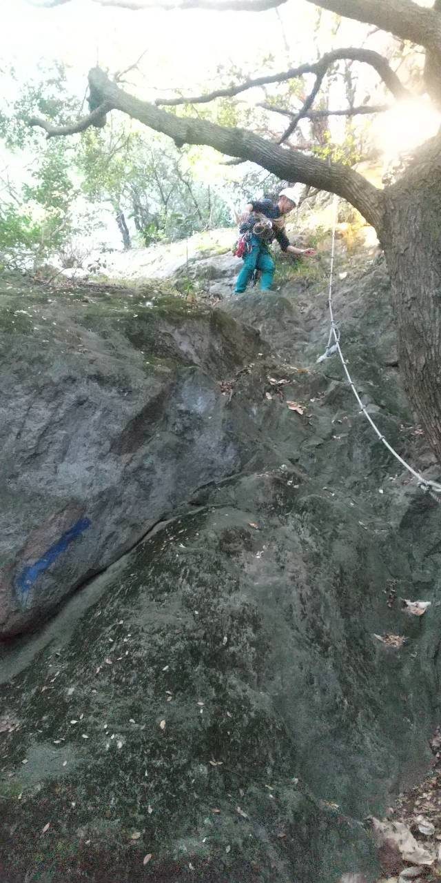 上の写真の赤矢印のルートを登ると1.5mくらいの高さの垂壁がありその上にスラブが広がる。この垂壁を登らず右に進んでいくと、古いリングボルトの確保支点がある。本日はシングルロープであり、屈曲して重たいのでここでピッチを切る。下の写真は2ピッチ目の1.5mくらいの垂壁を終了点であるこちらに向かってトラバースしてくる様子。