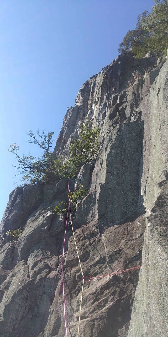 3ピッチ目についてはトポに「出だしの垂壁は少し力がいる」と記載の通りである。少し力を入れて体を上げると良いホールドが確か左手側にあったような。細い松の木まで上がったら左にトラバースであるが、そんなに距離的にトラバースしない。3mくらいのトラバースだったような。