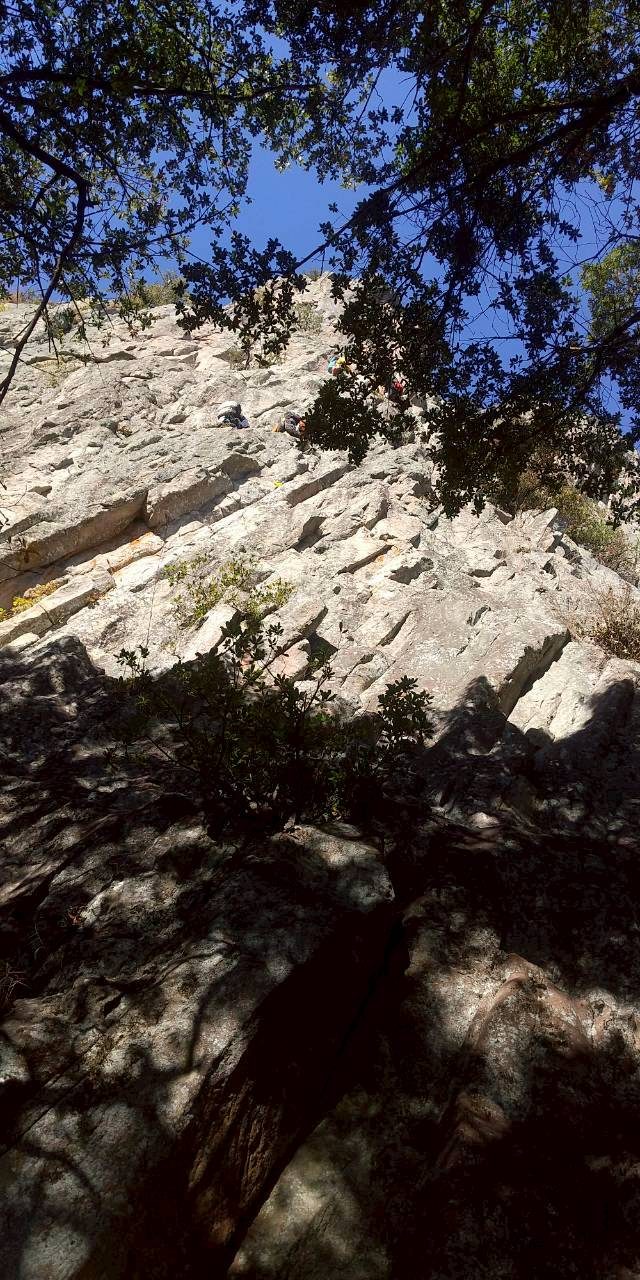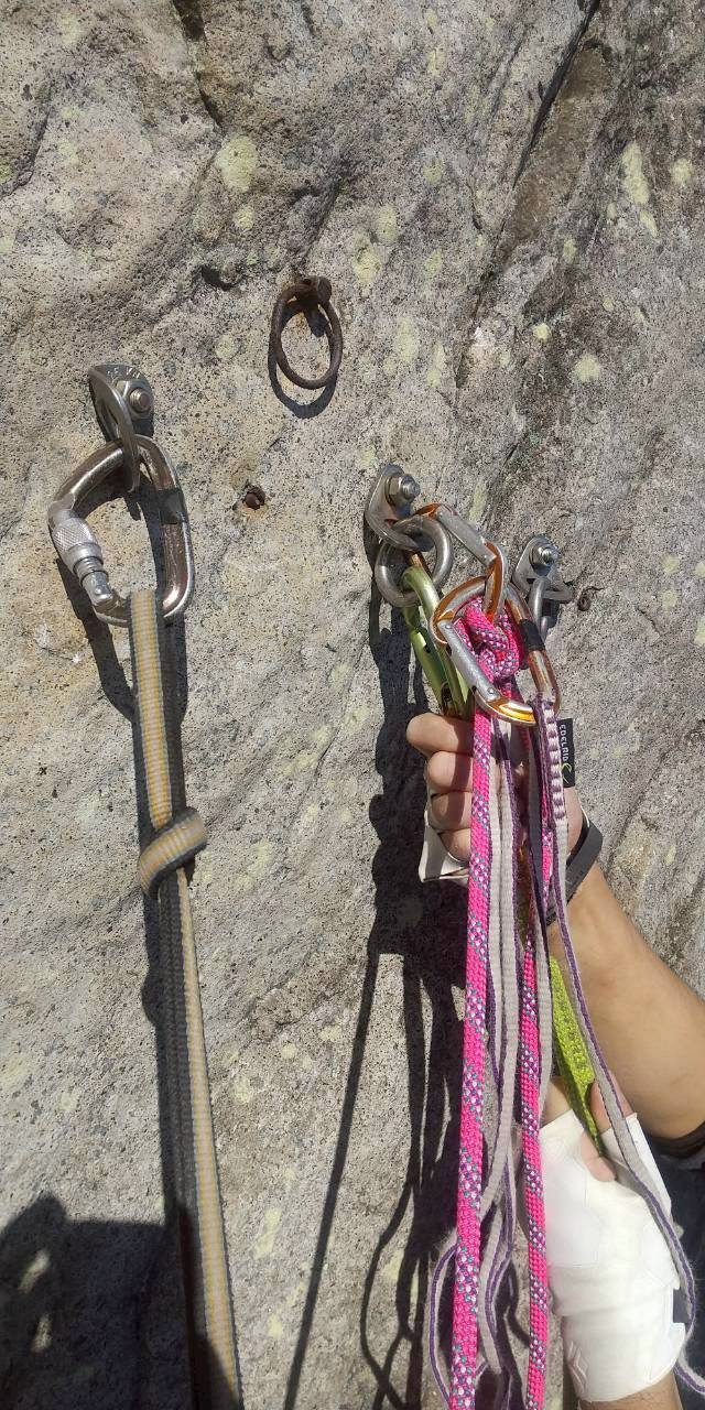 1ピッチ目はNabさんがリード。しかし進みが遅い。「5.7のグレードなのになぜだ?」とビレイをしながら思ったが、いざフォローで登ってみるとその理由が分かった。5.7のグレードは辛すぎる。ボルトは少ないし欲しい場所にないし、滑り落ちたら結構まずい、スラブ登りでやや危うい部分もある。「5.7のグレーディングした人の鼻の穴にオリーブの種を突っ込んでやりたい」と思いながらなんとか登れた。こわっ。この2ピッチのルートもところどころカムが取れるのでコンマから3番位を1セット持っていくべき。