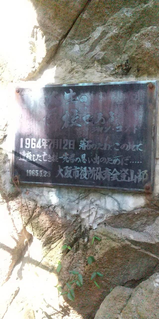 ちなみに「赤いクラック」取り付き点を過ぎてさらに岩沿いを左に進んでいくと「山は人生の学校である」と表記されたレリーフがあるダイレクトルート取り付き点となる。