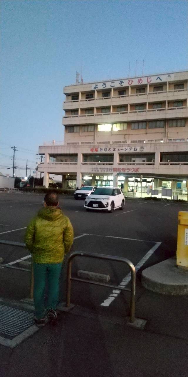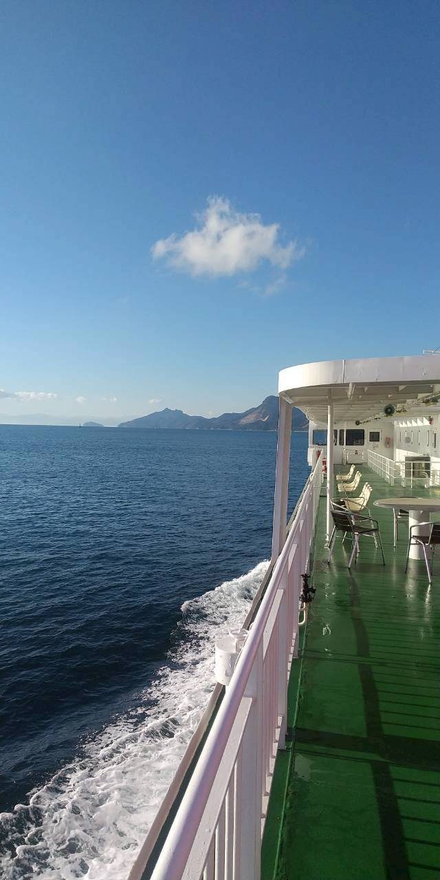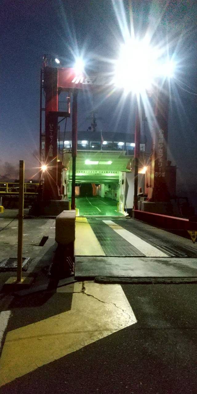 7:15姫路港出港のフェリーに乗るので、港の積載車のレーンに車を止めて仮眠。6:30にチケットカウンターが開く。事前にフェリーの予約はしようと思っていたが忙しくて先送りを続けていたら結局予約なしで来てしまったが、乗船することはできた。船内は意外と空いていた。時間的なものなのか時期的なものなのかは不明。