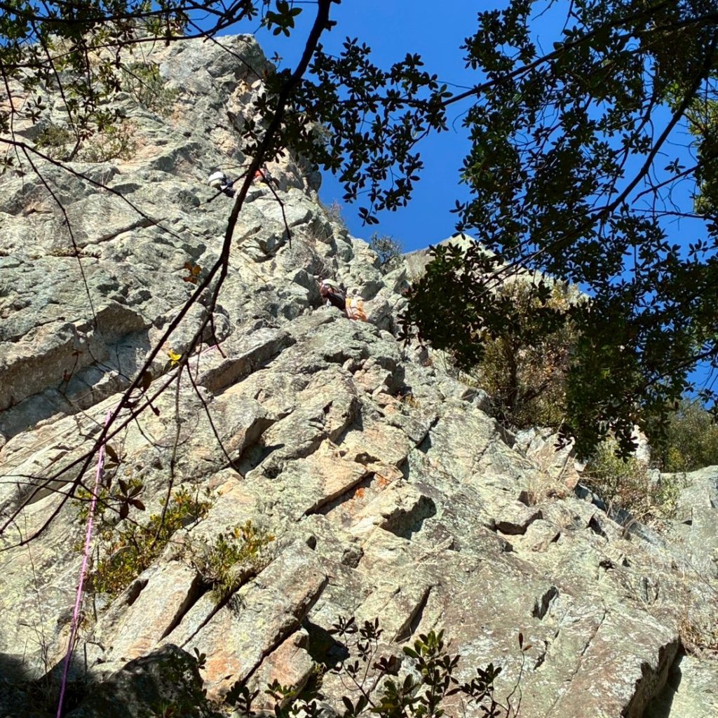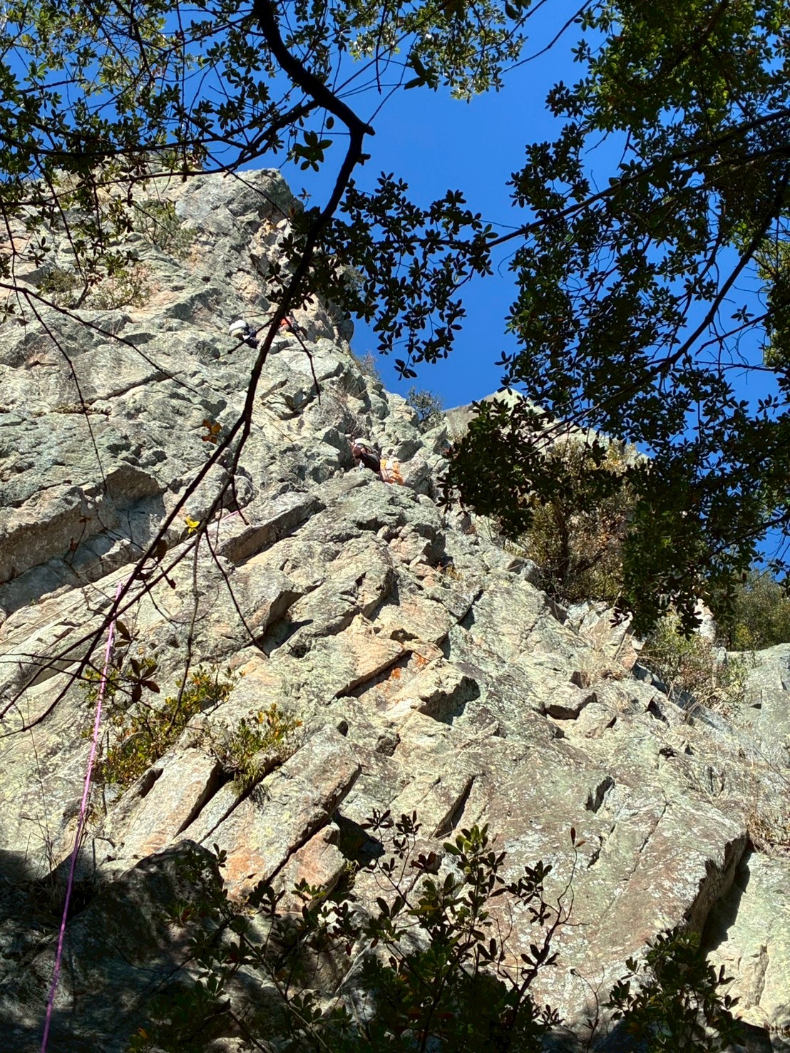 まずはトポの1ピッチ目、2ピッチ目をつなげて登る。先行に2パーティー。1ピッチ目グレードはトポ記載の通り5.8から5.9といった感じ。2ピッチ目のところは5.4~5.5とのこと。まあ、そんな感じ。