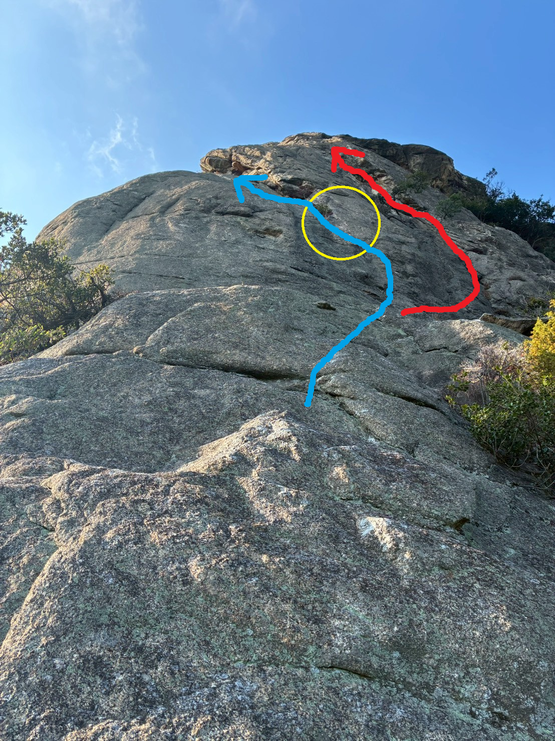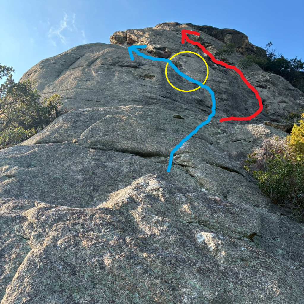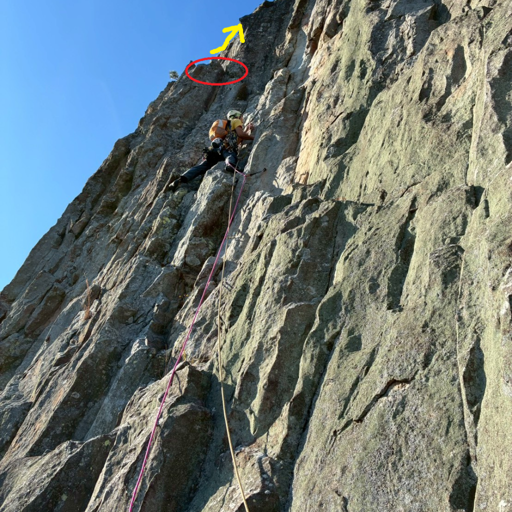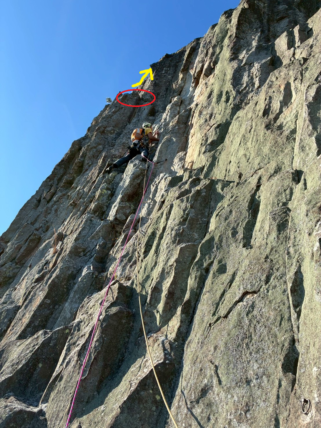 2ピッチ目の「大フレーク」はおそらく下の写真の青矢印が正規のルート。フレークの先にリングボルトの支点も見えたし、その後に上に抜けたときにその大フレーク付近にステンレスボルトのようなものもみえた。しかし、黄色丸の部分に支点が欲しいところだが一切なし。カムをはめられるクラックも無し。思いっきり行けば行けないことはなさそうだがそこまで一切支点は無し。ここにボルトが一本欲しいところ。なかなか危ないのでクラックの発達した赤矢印のルートで登って行った。こちらかクラックで支点も取れるし登りやすい。