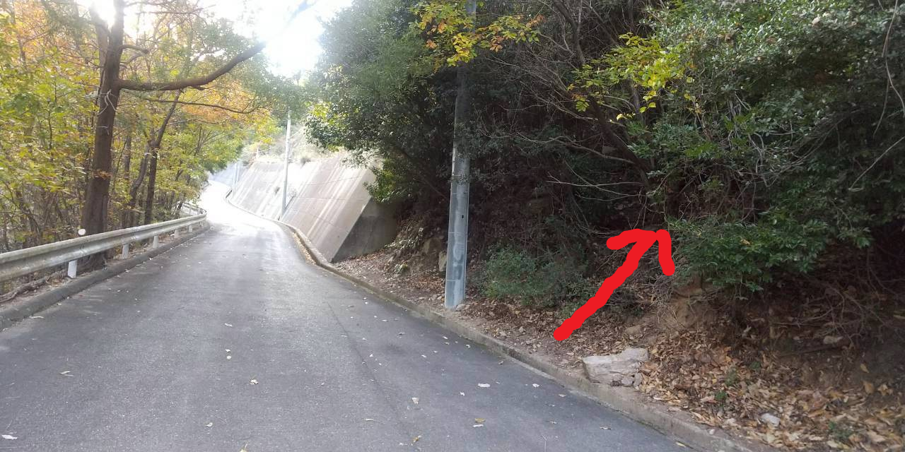 ダムまで行かず、オートビレッジ吉田から直接「ビギナーズロック」を目指すならば、下の写真の赤矢印部分を登っていくとすぐに至ることができる。