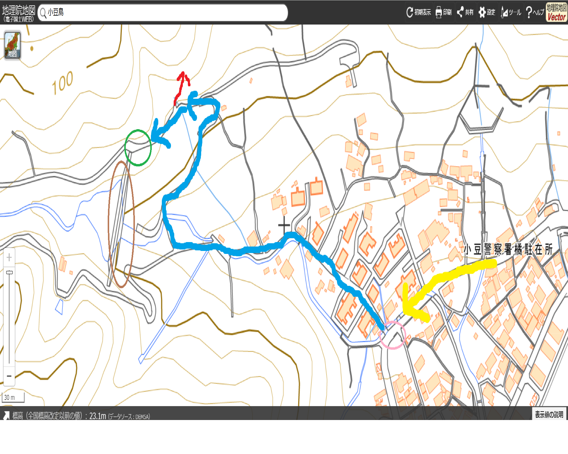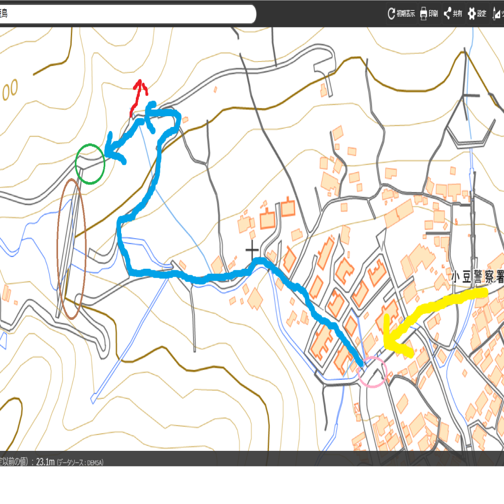 拇指岩の駐車スペースまでの道は下図の通り。以下は国土地理院地図(https://maps.gsi.go.jp/#5/36.104611/140.084556/&base=std&ls=std&disp=1&vs=c1g1j0h0k0l0u0t0z0r0s0m0f1)を加工したもの。黄色矢印が福田港から続く国道436号。ピンク丸のところで右折、細い道(右に集合住宅が見える)を青矢印の通りに進んでいく。すぐに林道のようになってくる。茶色丸の部分はダムの堰堤。堰堤の手前を右に曲がるので、堰堤までまっすぐ行くのは間違い。私たちは一度真っすぐ行ってしまいダム施設の部分でUターンして戻った。青矢印に従い緑丸部分にスペースがあるので、そこに駐車。この場所は堰堤の上部が目の前に見える。通ってきた道を少し戻って赤矢印部分の登山道を登って拇指岩を目指す。