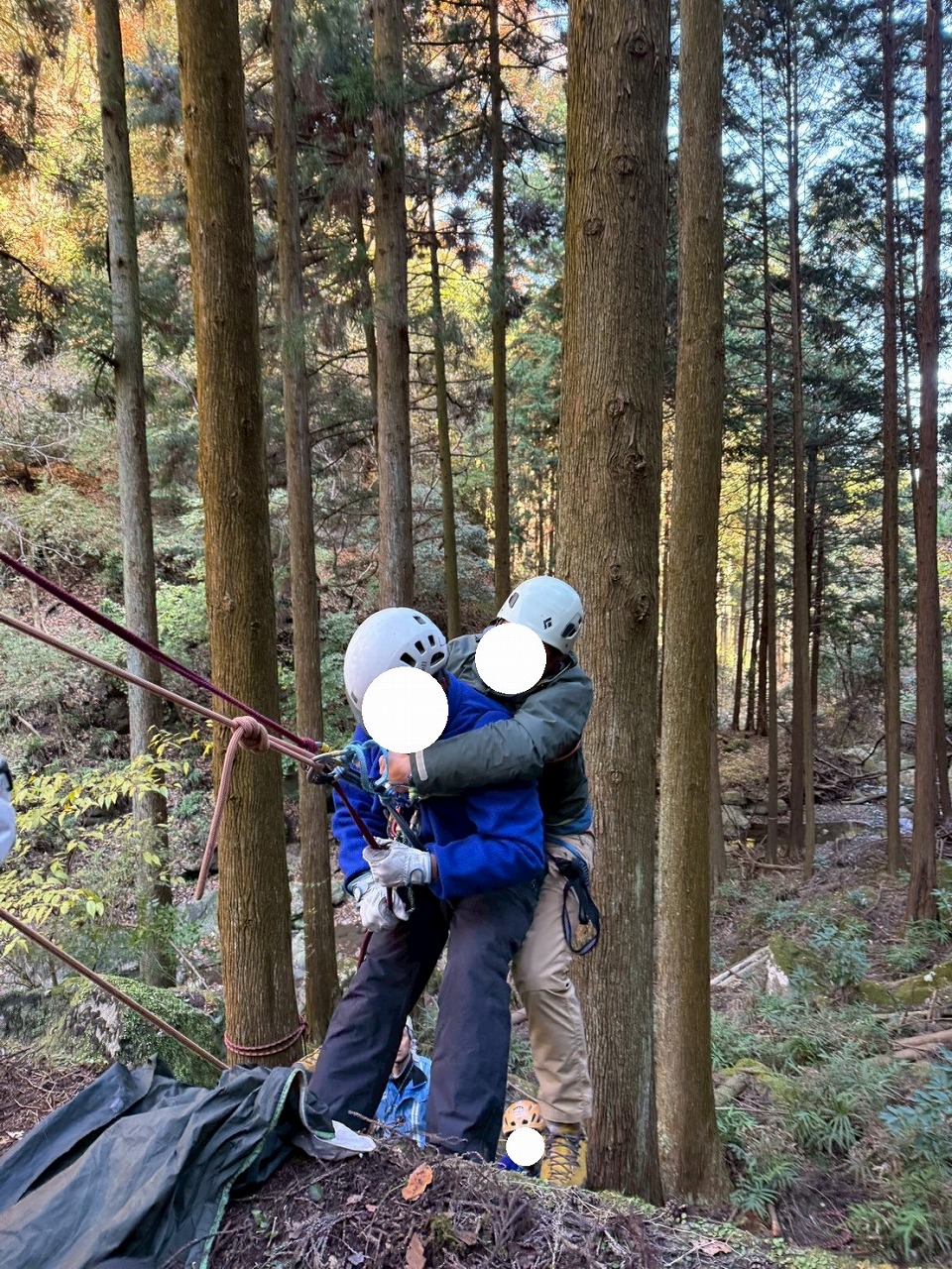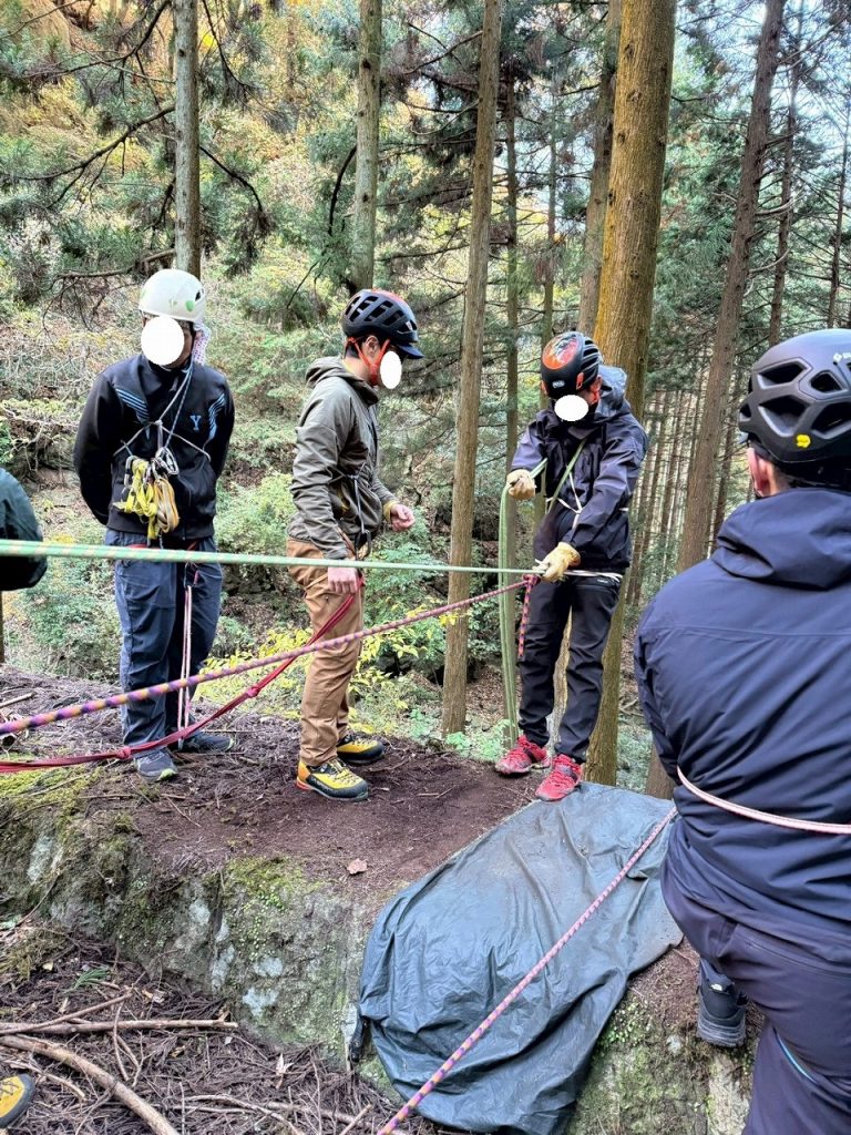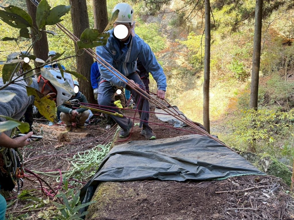 ここからは二組に分かれて、急な斜面の下で倒れている人間を発見して、登山道に引き上げる。という状況で今までやってきた搬送から引き上げを全部使ってやってみます。訓練なので堰堤を急な斜面と見立てて、自パーティーは4人程度としています。