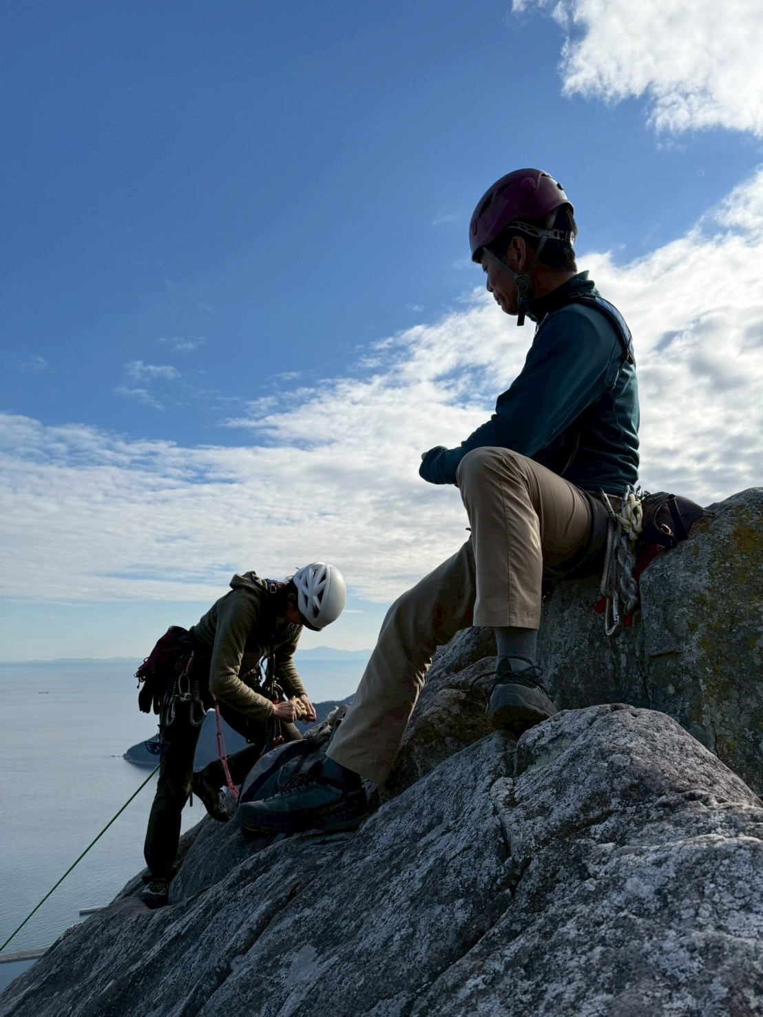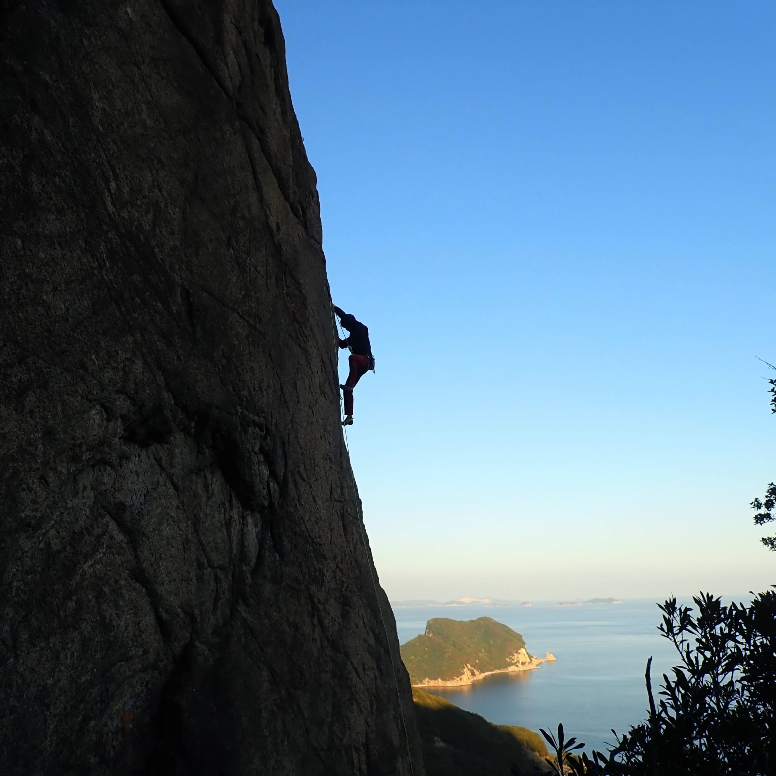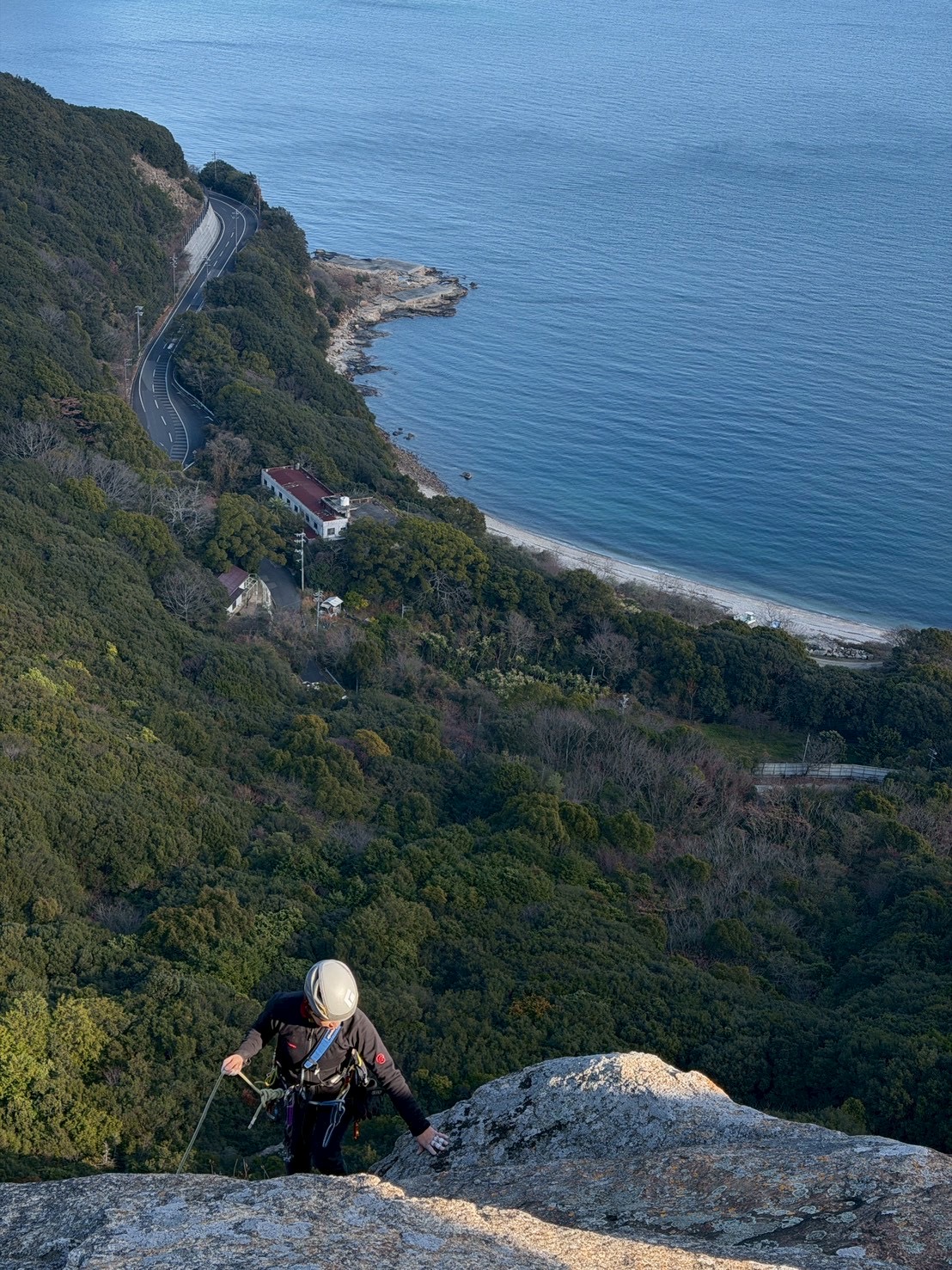 ビギナーズ下の岩場で、びっしょり濡れたスラブにヒヤヒヤしながら登り、ビギナーズ上の岩場で、意外と乾いていた長いルートをウキウキしながら登り、小豆島のクライミングは終了となりました。