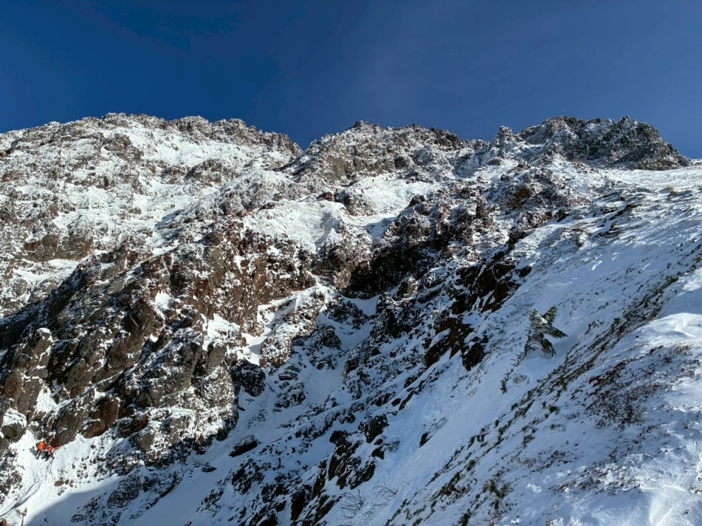 下部岩壁からの雪稜は細かく3ピッチ程度で分けていきましたが、ルートが分かっているならコンテで一気に行ってしまっても良いのかなと感じました。